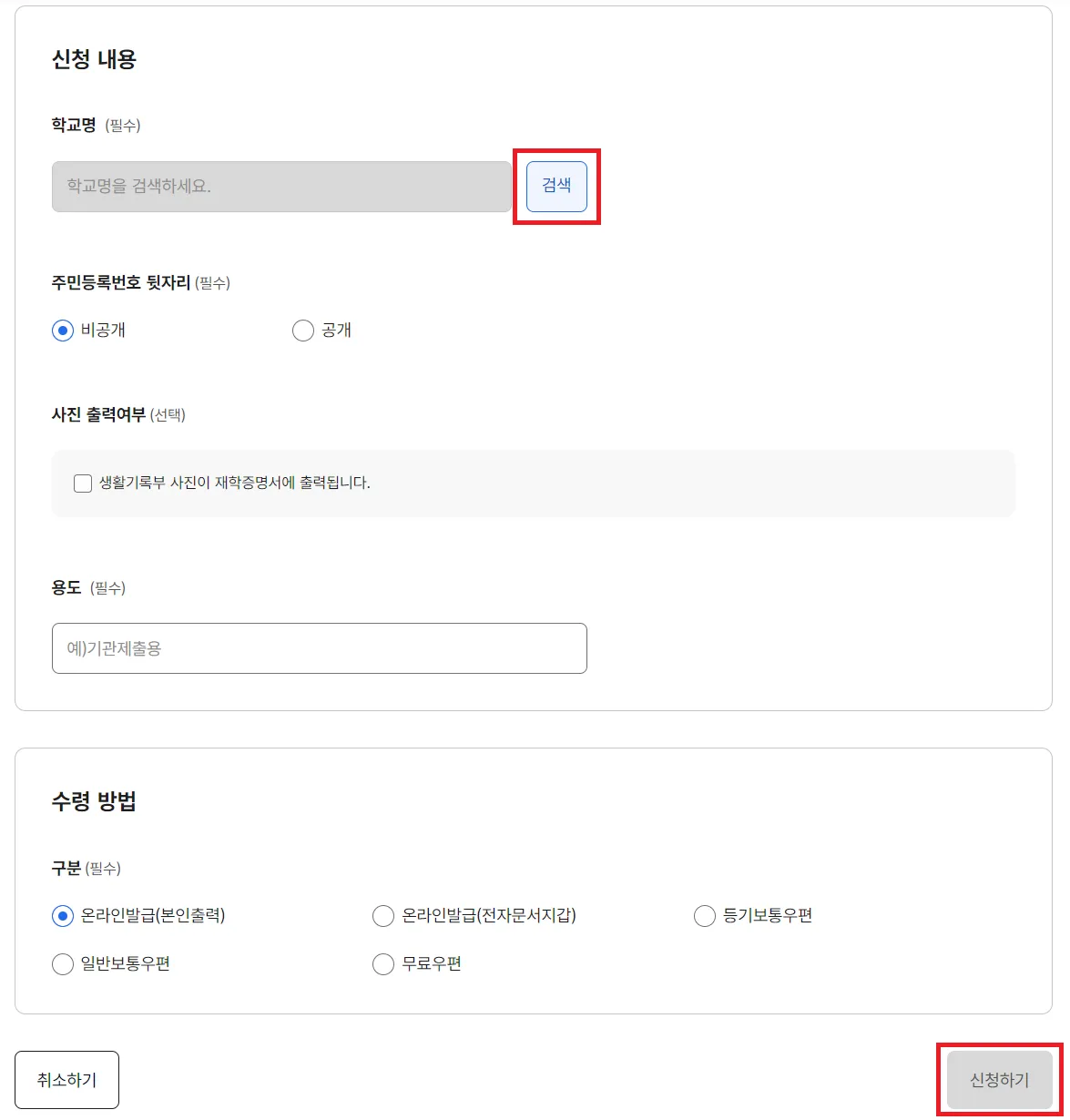 • 재학증명서는 본인 또는 자녀의 보호자가 신청할 수 있으며, 온라인 발급 시에는 대리 신청이 불가능합니다. 따라서 보호자가 직접 신청해야 합니다.