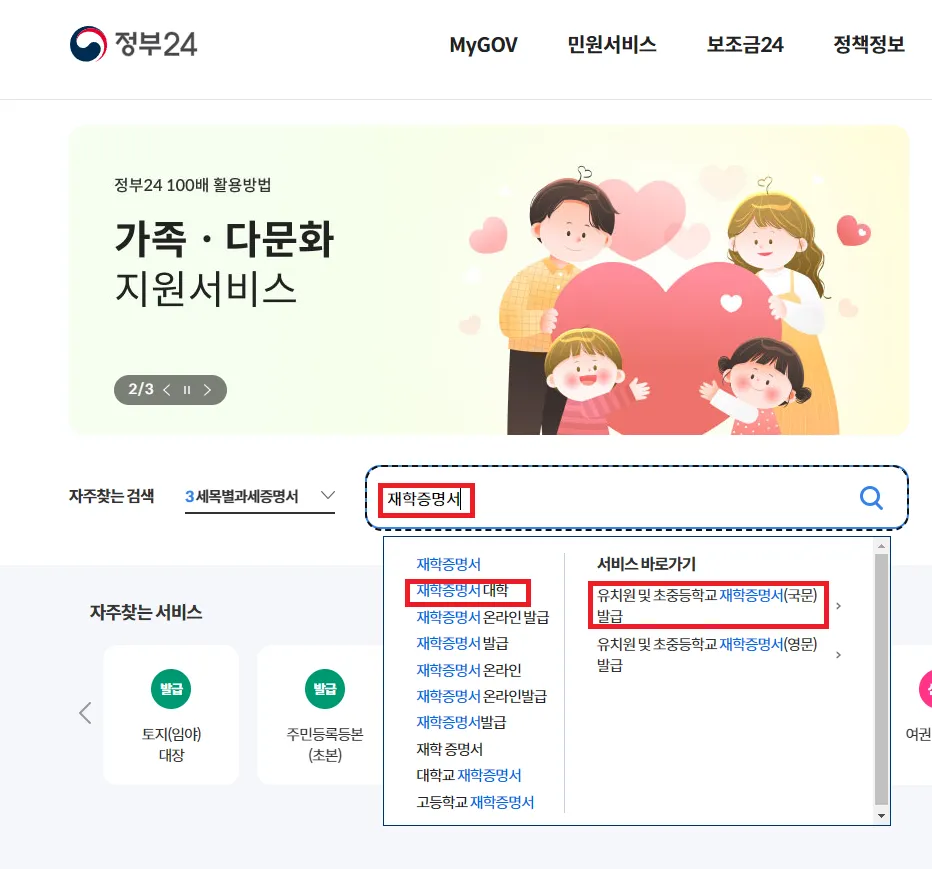 자녀 재학증명서 인터넷발급 대문